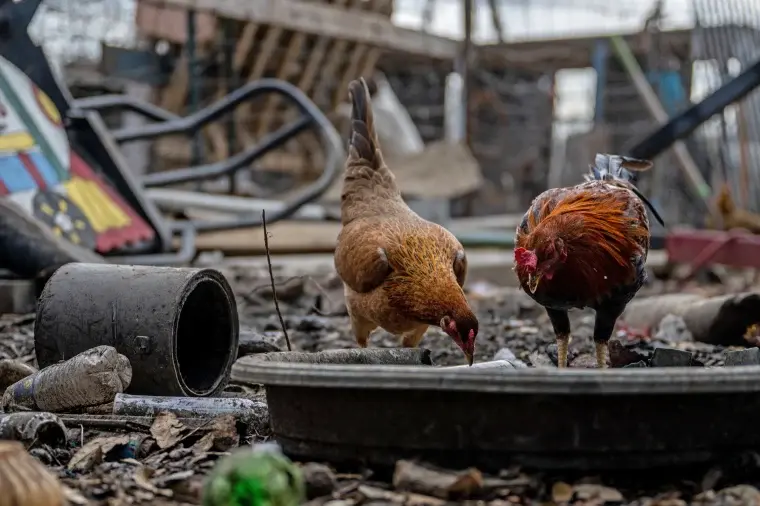 Петухи пьют из кастрюли на заднем дворе на ферме в Остине, 23 января