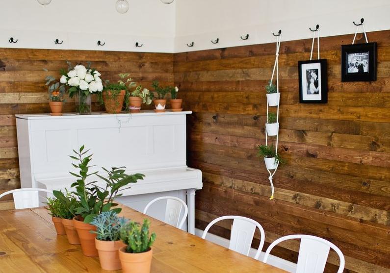 На фото последнюю панель покрасили белой эмалью по дереву и добавили декоративные крючки, но получилось практично. Особенно эффектно на таких деревянных стенах смотрятся вьющиеся растения в белых горшках.