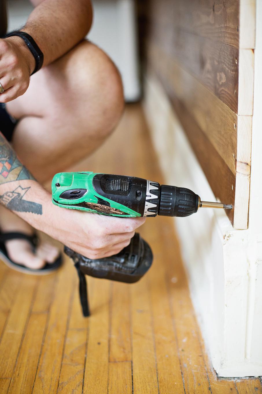 Теперь нарежьте доски нужных размеров и начните прикручивать их снизу. Лучше всего разместить каждую плитку на стене, измерить, а затем отрезать. Даже самые гладкие стены оказываются неидеальными, поэтому лучше перестраховаться. Время от времени отступайте, чтобы полюбоваться происходящим вдалеке, чередуя панели разных оттенков.