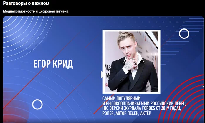 Просматривая видео об уроках "Разговоры о важном", наткнулся на Егора Крида. Оказывается, популярного певца позвали в качестве эксперта и попросили осветить одну из тем «Скам». Я ничего не имею против творчества Крида, но каждый должен заниматься своим делом. Разве нельзя было найти профессионала в России, который бы записал видео?