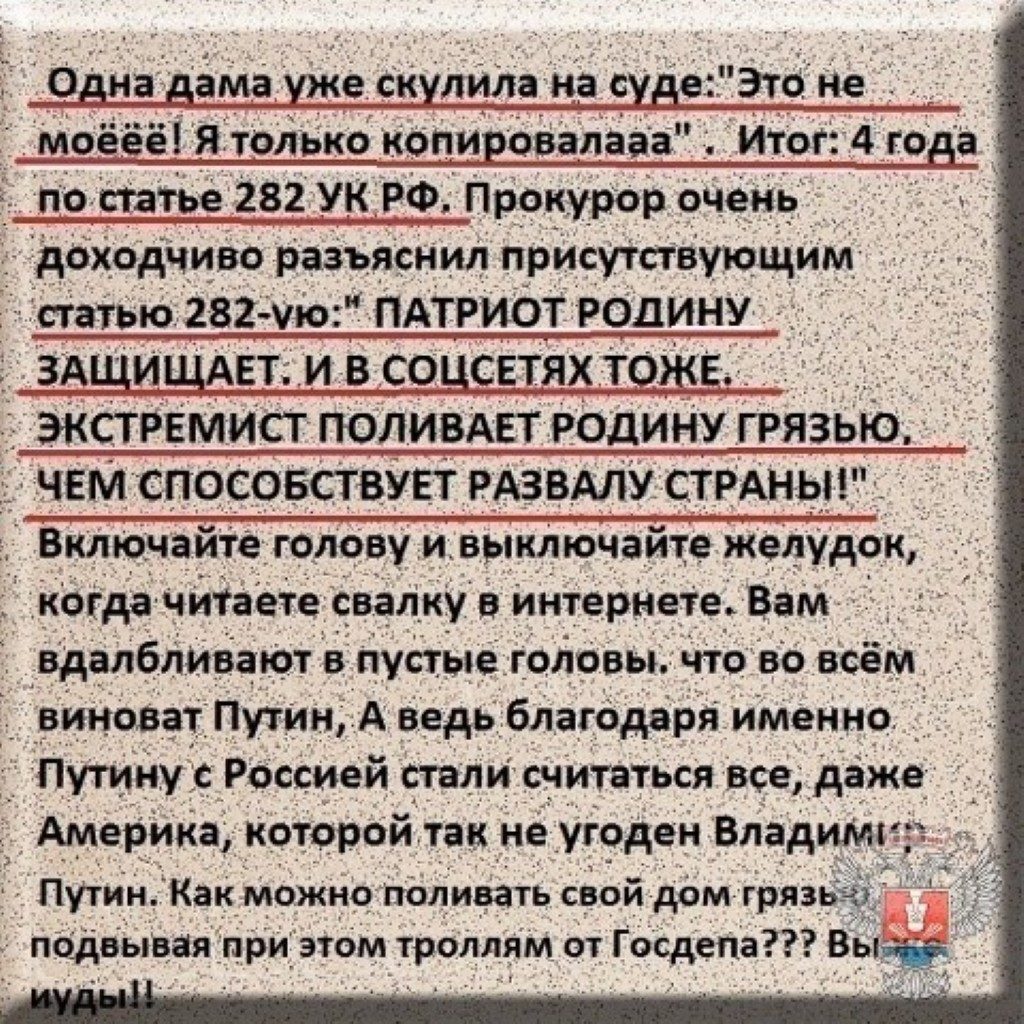 Власть Под Себя Новые Законы Выдумала и Продолжая Дело Тридцатых Готов , Чтобы Каждый Стучал На Ему не Угодного , (из за Не Мытой Во время сковородки или Другие причины ) ! Кто Уже Не Государство - Это почти как в КНДР ! На Митинги, Встречи Больше Трёх Не Собираться - сразу в Кутузку ! Штрафы , Отсидки до Девяти лет За Своё Мнение! А Кто поставит Дизлайки , то Он Доносчик и поддерживающий Режим ! Павлики М ещё Существуют !