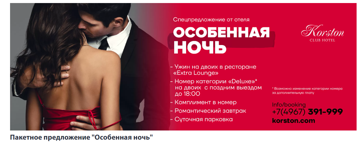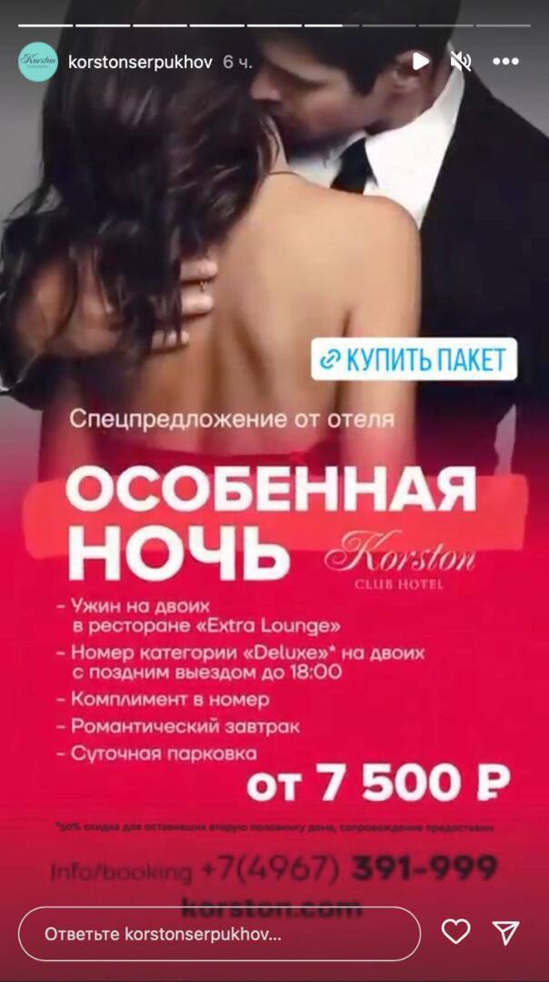 Со следующим текстом:В городе Серпухове отель Korston решил провести акцию для неверных мужей - всем, кто придет в отель без "второй половинки" отель гарантировал 50% скидку и обещание предоставить "сопровождение". Сторис и сейчас доступна в официальном аккаунте гостиницы.