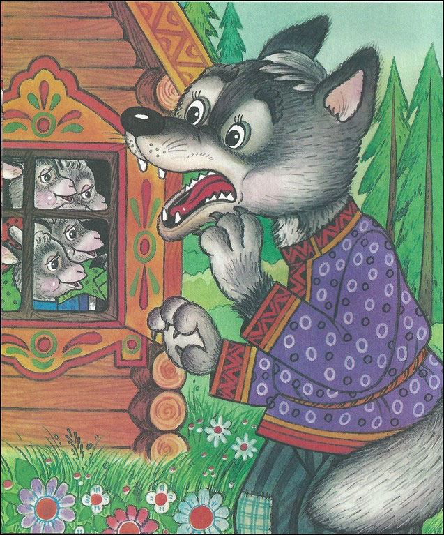 Волк подслушал как поёт мама, приходит к дому козлят, когда мама козлят ушла из дома, и стал напевать своим грубым голосом.
