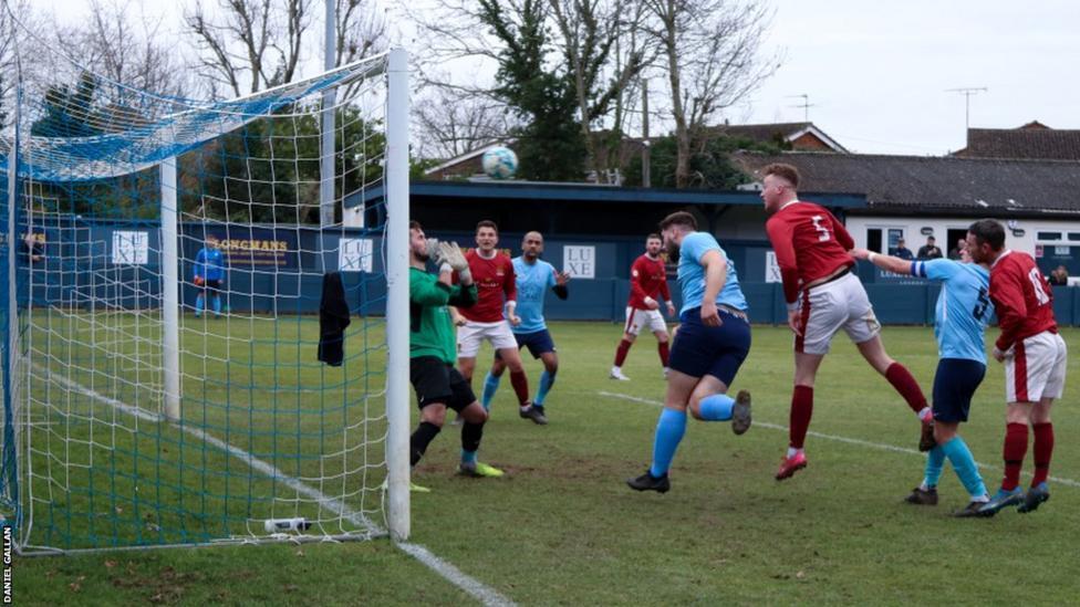 Dial Square подает угловой, и после нескольких небрежных касаний со стороны обеих команд Сьюэлл забивает свой второй мяч. На другом конце, позади вратаря Dial Square Аарона Бафтона, висят два больших баннера.