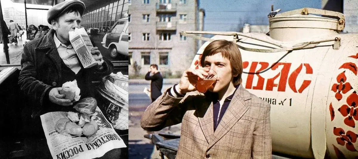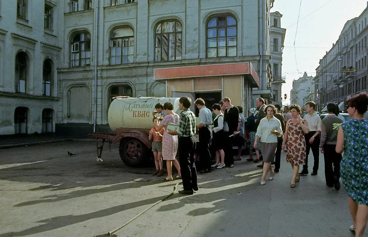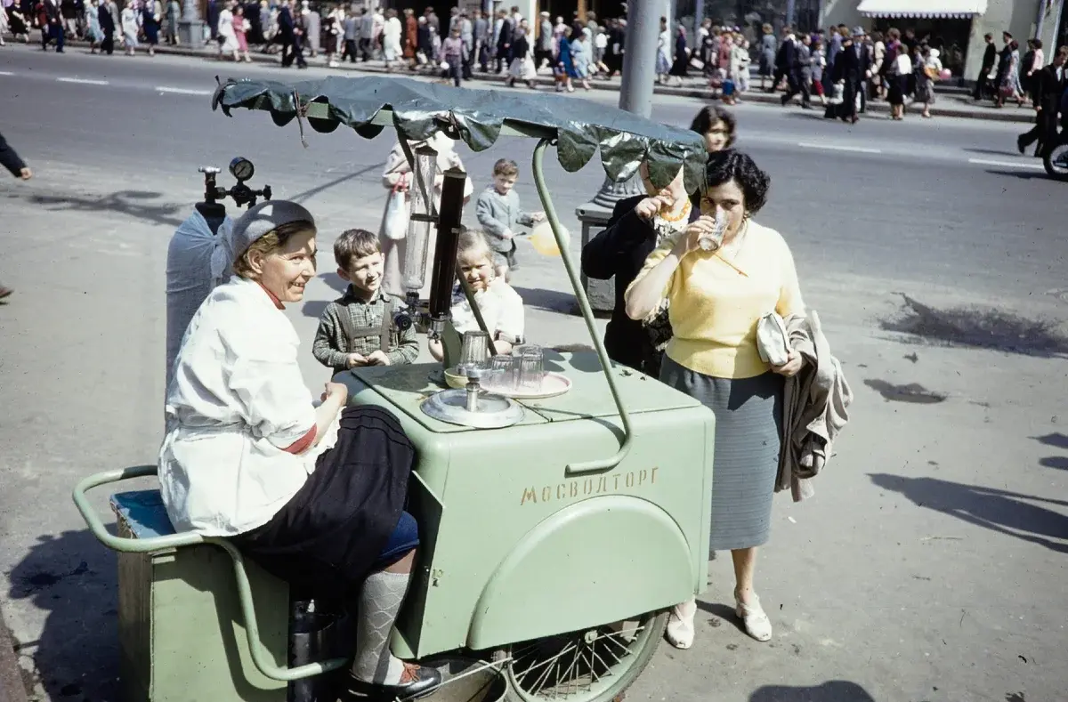 На улице, особенно возле метро, продавали по 5 копеек пирожки с вареньем и по 10 копеек с мясом. Там были контейнеры, в которых обычно находилась средняя или большая тетя, и всегда был горячий пирог. Летом газированная вода продавалась на улицах и в парках - 1 копейка без сиропа, 4 копейки с сиропом. В магазине газировка продавалась в бутылках и стоила около 20-25 копеек. Самым дорогим оказался "Крюшон" - 37 копеек. В торговых автоматах на улице стакан воды с сиропом стоит 3 копейки.