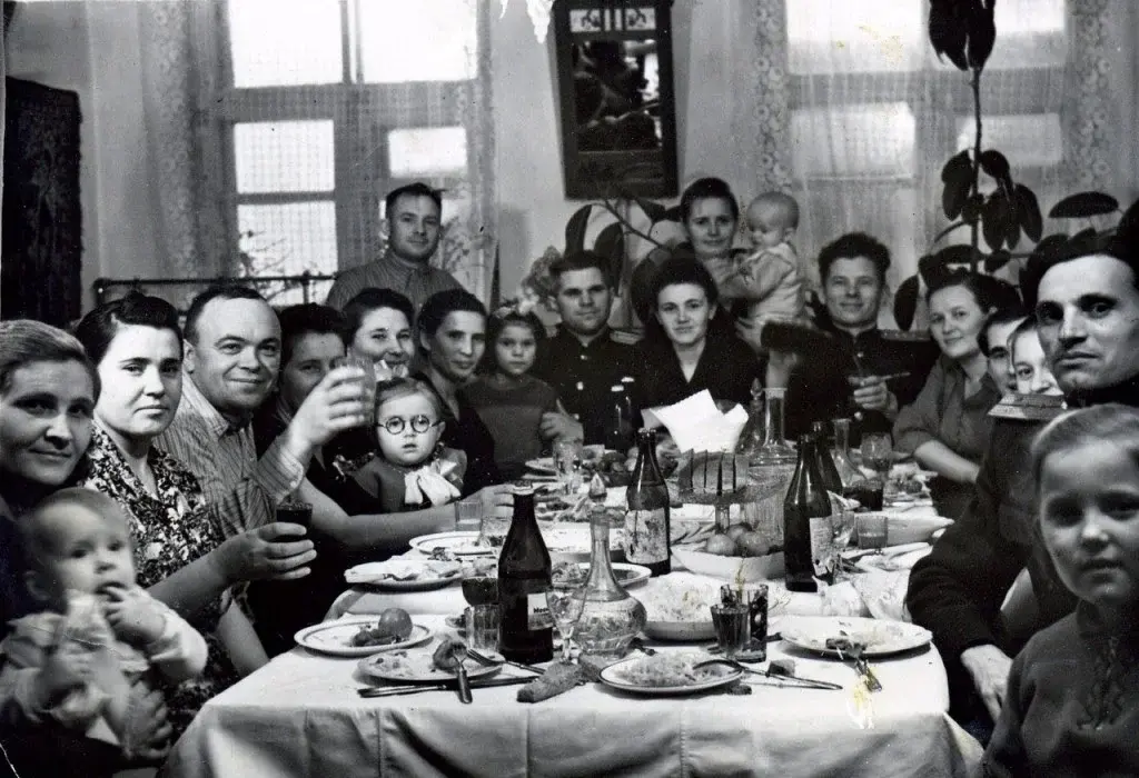 В СССР существовала поговорка, что в магазине ничего не было, но все было на столе советской семьи. Мы празднуем Новый год в 5/1, 11/7, 3/8, а в 1965 году был добавлен День Победы и даже 2/23. Семья собралась вместе, и были приглашены друзья. Обязательным атрибутом праздника было хоровое пение. Они пели русские народные песни, современные подмосковные эстрадные партии. Они всегда пели: "Хасбулат - храбрый дьявол, твоя бедная сакля"... ". Моя тетя специально распечатала тексты песен и раздала их всем женщинам на семейном празднике. По какой-то причине здесь пело большинство женщин.