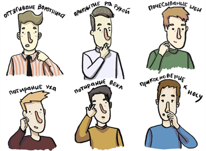 Каждый из нас хотя бы раз в жизни задавался вопросом - как же узнать врёт он мне или нет? Но, на самом деле не всё так сложно и всегда можно узнать лжеца, если иметь информацию о жестах которые непроизвольно делает человек во время обмана. Некоторые из них представлены на картинке выше, давайте разбираться.