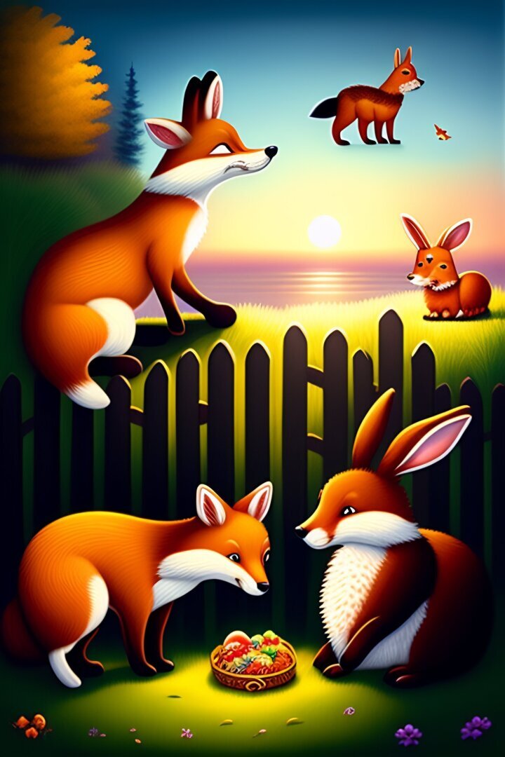 Давным-давно в тихом лесу жили два зверя — хитрая лиса и быстрый заяц. Оба они часто встречались друг с другом, когда искали пищу в разных местах. Лис был умным и хитрым, его хитрость часто приводила к тому, что он находил самые вкусные лакомства раньше всех остальных зверей в лесу. Несмотря на свою сообразительность, лисенок никогда не задумывался о том, чтобы сделать что-то плохое, что могло бы навредить другим или привести его к каким-то неприятностям. Поэтому вместо того, чтобы причинить кому-то вред или сделать что-то плохое, он предпочитал искать еду. Однако однажды, когда лис шел за едой, его путь пересекся с путем кролика, притаившегося в том же месте — он был так быстр, что успел исчезнуть из виду прежде, чем он смог его поймать! Лиса была очень заинтригована этим проворным существом и решила пойти по его следу в надежде поймать его. На следующий день, как только на горизонте забрезжил рассвет, лис с энтузиазмом начал свой путь в глубь дикой природы, ища следы, оставленные, как ему казалось, его новой неуловимой добычей — зайцем! Пройдя по следам зайца через множество кустов и деревьев, они в конце концов оказались на поляне, где цвел большой фиолетовый цветок.
