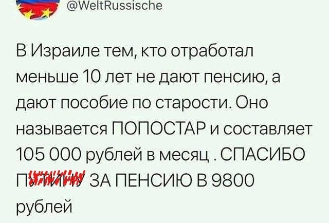 Ты пишешь про Израиль, а ты там был хоть разок? Ты цены на ЖКХ там видел? Ты цены в магазинах там видел? Видимо от такой огромной пенсии и пособий, все наши убежавшие пенсионеры, написали заявление на получение российской пенсии. Приехала я как-то в подруге , ужас , воду не лей, свет не включай, дышать в доме нечем но кондиционер нельзя, дорого.
