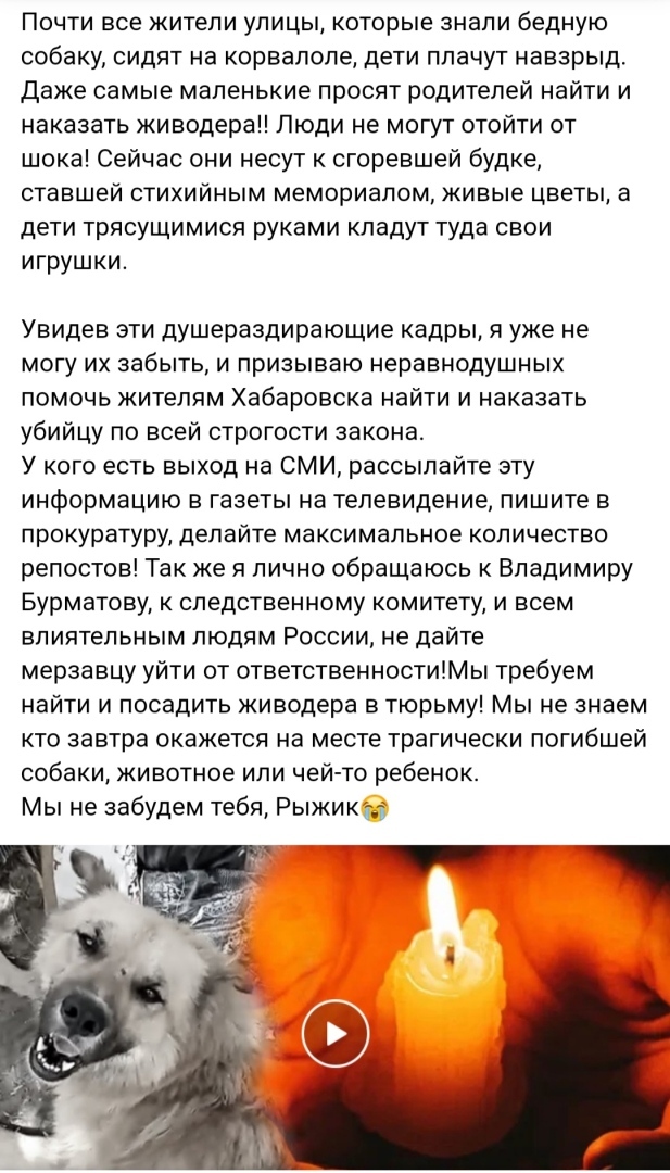 Но, как это всегда случается в России, в очередной раз отметилось дохло: будку заблокировали, облили горючей смесью и сожгли... Вместе с собакой... Это стало шоком не только для всех людей улицы Артёмовский!