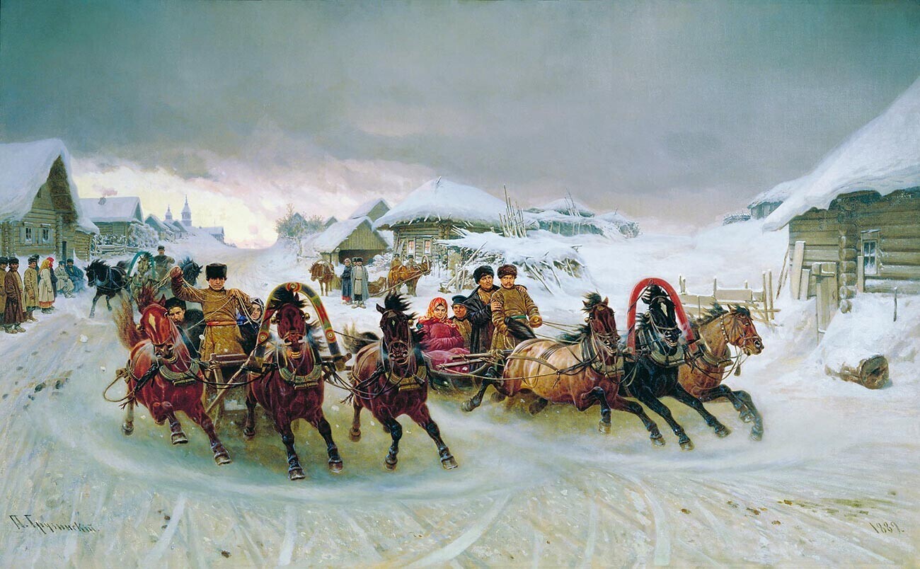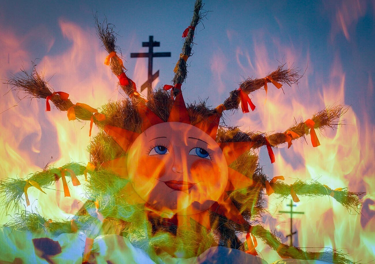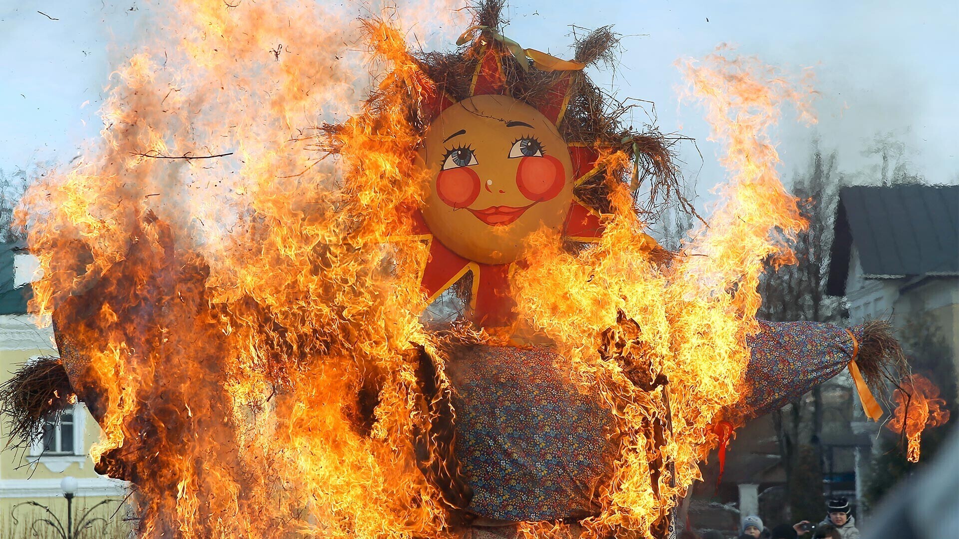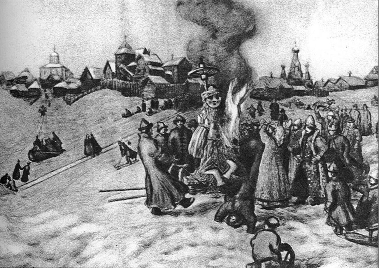 Переход от зимы к весне сопровождался ритуальным “умерщвлением” чучела из сена, которое сжигали на четвертый день Масленичной недели. Фольклорист, этнограф, лингвист и археолог Всеволод Миллер (1848-1913) считал, что чучело олицетворяет старый год, который был убит до того, как наступил новый. Евгений Аничков (1866-1937), другой фольклорист, предположил, что чучело символизирует смерть, а его сожжение – торжество жизни.
