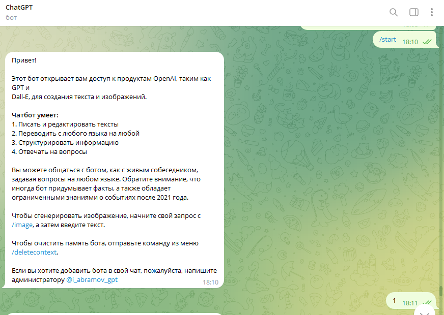 Этот бот открывает вам доступ к продуктам OpenAI, таким как GPT и