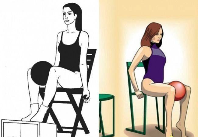 Сядьте на прочный стул (тот, у которого нет колес), поставьте ступни на пол, согнув колени под прямым (90-градусным) углом. Поместите подушку (или мяч) между коленями и бедрами.