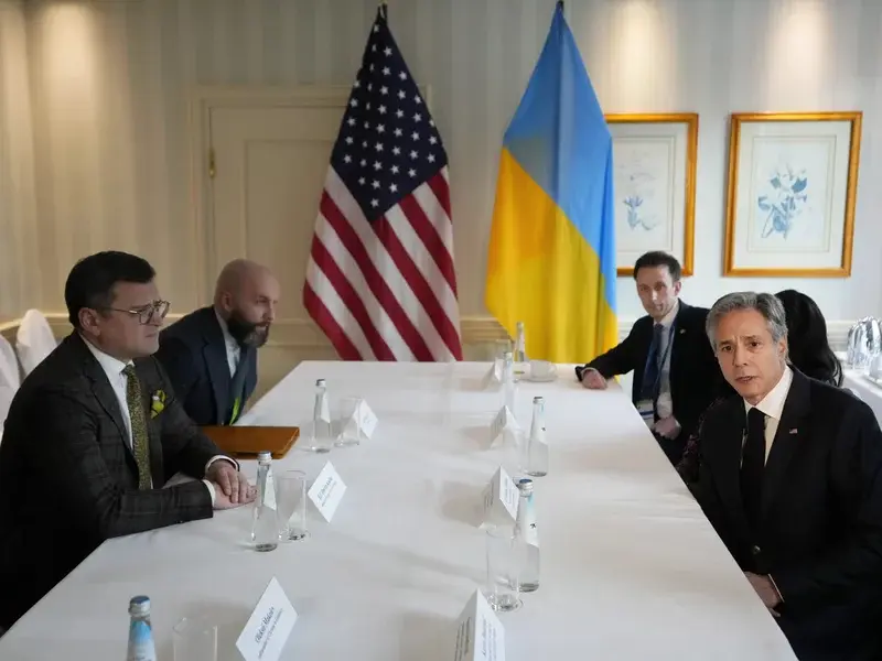 Госсекретарь США Энтони Блинкен (справа) встречается с министром иностранных дел Украины Дмитрием Кулебой (слева) на Мюнхенской конференции по безопасности в Мюнхене, суббота, 18 февраля 2023 г. С 17 по 19 февраля 2023 года в отеле Bayerischer Hof в Мюнхене.