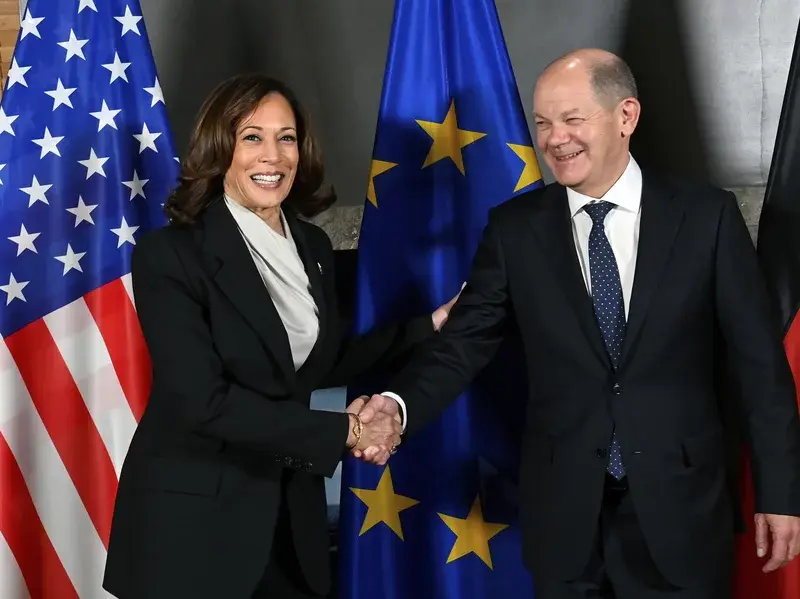 Вице-президент США Камала Харрис (слева) и канцлер Германии Олаф Шольц (справа) обмениваются рукопожатием перед двусторонней встречей на Мюнхенской конференции по безопасности в Мюнхене, Германия, в пятницу, 17 февраля 2023 г. 59-я Мюнхенская конференция по безопасности (MSC) проходит место с 17 по 19 февраля 2023 года в отеле Bayerischer Hof в Мюнхене.
