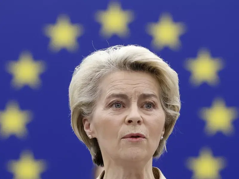 Председатель Европейской комиссии Урсула фон дер Ляйен выступает на заседании, посвященном году после вторжения России в Украину, в среду, 15 февраля 2023 г., в Европейском парламенте в Страсбурге, восточная Франция.