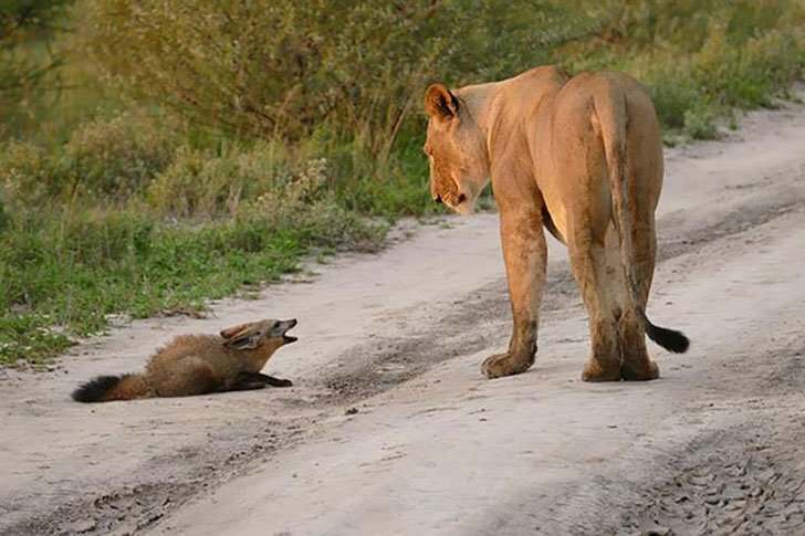 На картинке ниже вы увидите лису, пойманную в ловушку в присутствии львицы. Жертвы в таких обстоятельствах обычно убегают, спасая свою жизнь, даже если шансы против них. Но так как эта лиса была ранена, она не смогла убежать в безопасное место. Остается неясным, как лиса, находящаяся под угрозой исчезновения, получила травму, но он не мог много двигаться, когда голодная львица угрожающе приближалась к нему.