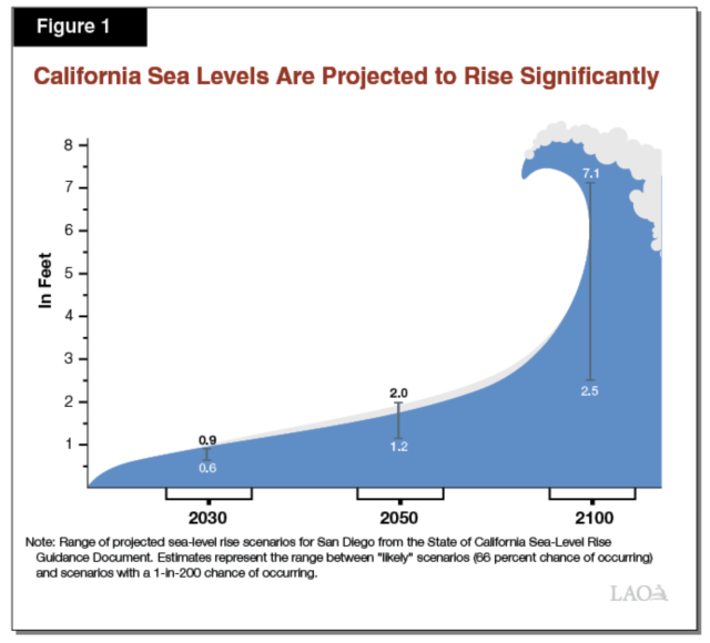 С тех пор прогнозы того, насколько серьезной будет эта проблема, стали еще более ужасными. В 2020 году Управление законодательного аналитика, беспристрастный советник по финансовым и политическим вопросам Законодательного собрания Калифорнии, опубликовало отчет , в котором говорится, что при сценарии сохранения высоких выбросов парниковых газов в Сан-Франциско к 2100 году уровень моря может подняться на 7 футов.