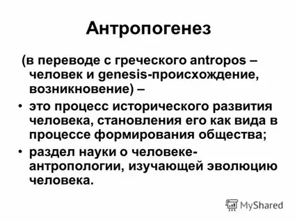 Часть биологической эволюции, которая привела к появлению человека разумного, отделившегося от прочих гоминид, человекообразных обезьян и плацентарных млекопитающих, процесс историко-эволюционного формирования физического типа человека,… Читать ещёЧасть биологической эволюции, которая привела к появлению человека разумного, отделившегося от прочих гоминид, человекообразных обезьян и плацентарных млекопитающих, процесс историко-эволюционного формирования физического типа человека, первоначального развития его трудовой деятельности, речи. Изучением антропогенеза занимается множество наук, в частности, антропология, палеоантропология, археология, генетика, лингвистика. "