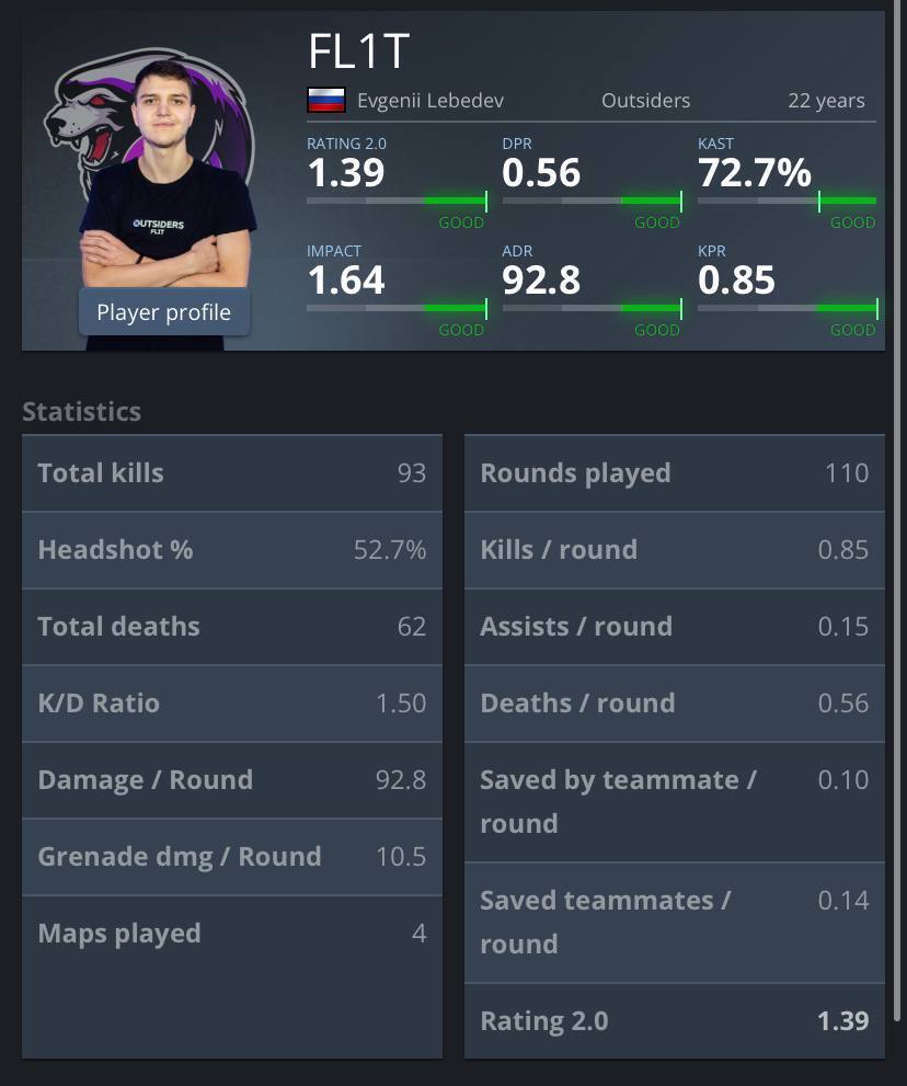 На 4 место топ-5 рейтинга попал Российский игрок организации Outsiders Евгений"Fl1t"Лебедев.