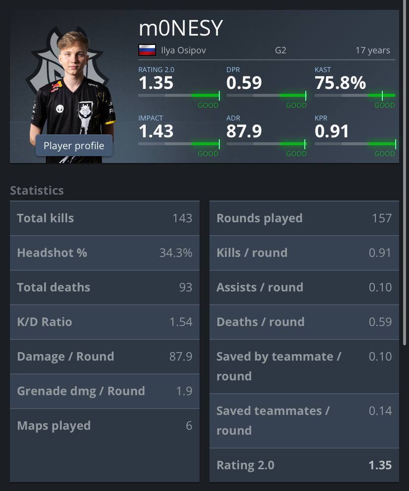 И закрывает топ-5 самый молодой игрок тир-1 сцены Илья"m0NESY"Осипов.Илья турнир за турниром показывает сильнейшую индивидуальную игру.Снайпер французской команды G2 порой становиться ключевым игрок на сервере.