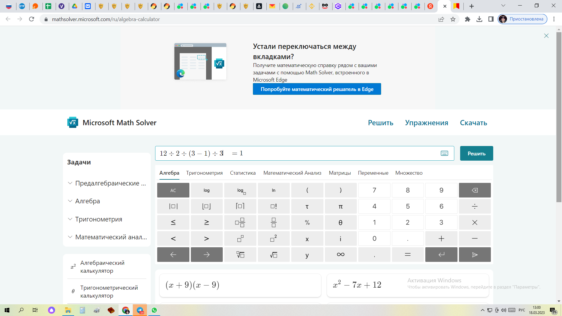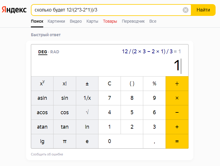 Помня, как нас учили в советское время считать выражения со скобками, я быстро пришел к результату, что должна быть единица. Потому что я отлично помню, что нас учили, что в первую очередь вычисляется умножение, следом деление и потом только суммирование и вычитание. Поэтому расчет мой был прямой как лом: поскольку в скобках у нас результат 2, то на него я умножил двойку, стоящую перед скобками, получив таким образом четверку. Поделив 12 на этот результат, я получил в числителе тройку, что вкупе с тройкой в знаменателе и дало искомое значение единицу.