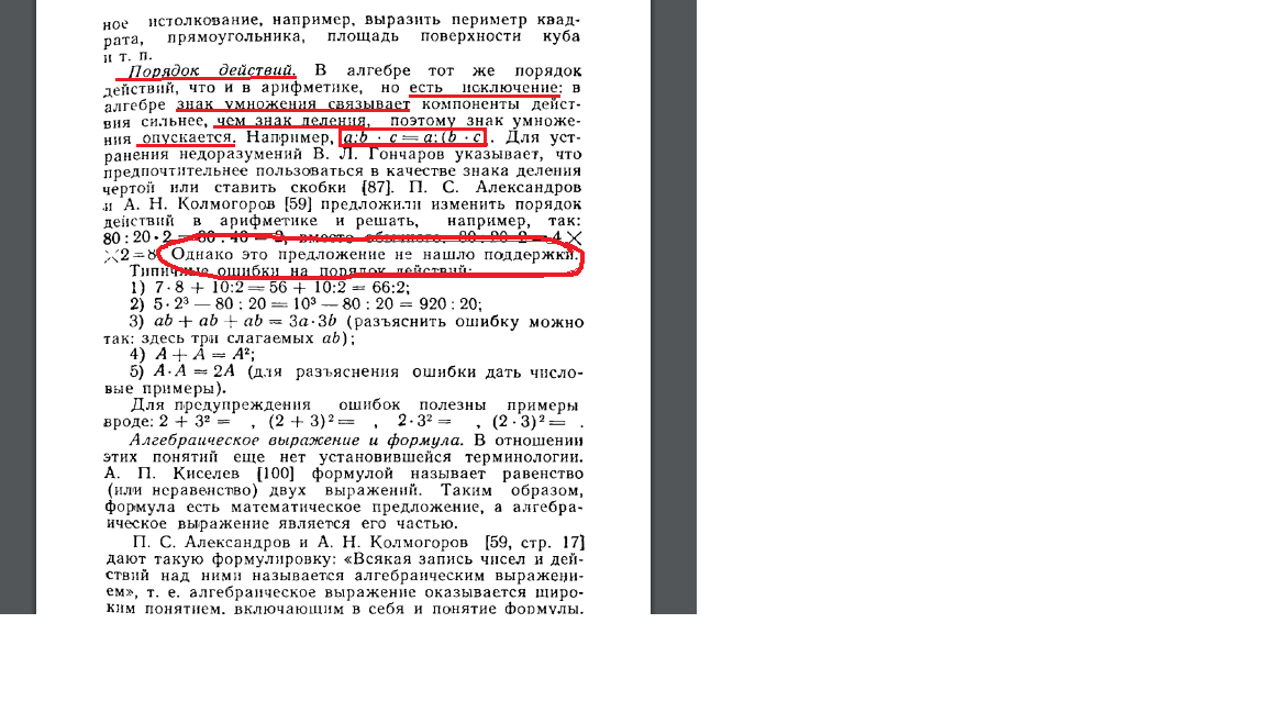 Я тоже в этом решении привел ответ 1 и кстати в своих 15-20 комментариях обосновывал это теми же аргументами на те же правила называя формулу алгебраической а не арифметической за счет опущенного знака умножения и привел веб ссылки на выдержки из книг рисунок которых приведен выше в статье недели две назад .