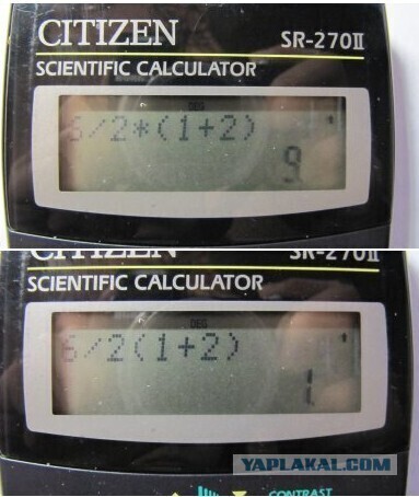 Все это мне пришлось заново вспоминать, поскольку арифметику я проходил в начальных классах и уже все забыл. Однако из того то, что мы проходили на уроках алгебры более сорока лет назад, я кое-что все же помнил. И я отлично помню, как мы решали выражения со скобками. И порядок был неизменно такой: сначала решаются значения в скобках, а то, что стоит перед скобками, потом умножается на полученный результат. Это без вариантов, потому что я за решение этих примеров пятерку в школе получал. И вот теперь такой пердимонокль...