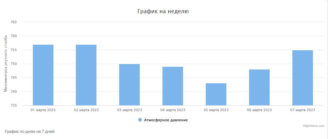 На протяжении всей недели, атмосферное давление будет в пределах от 743 до 759 мм рт.ст. Влажность воздуха будет составлять в среднем 88%. Самое высокое атмосферное давление будет в четверг, 02 марта 2023 г., и составит 759 мм рт.ст, а самое низкое будет в воскресенье, 05 марта 2023 г. и составит 743 мм рт.ст.