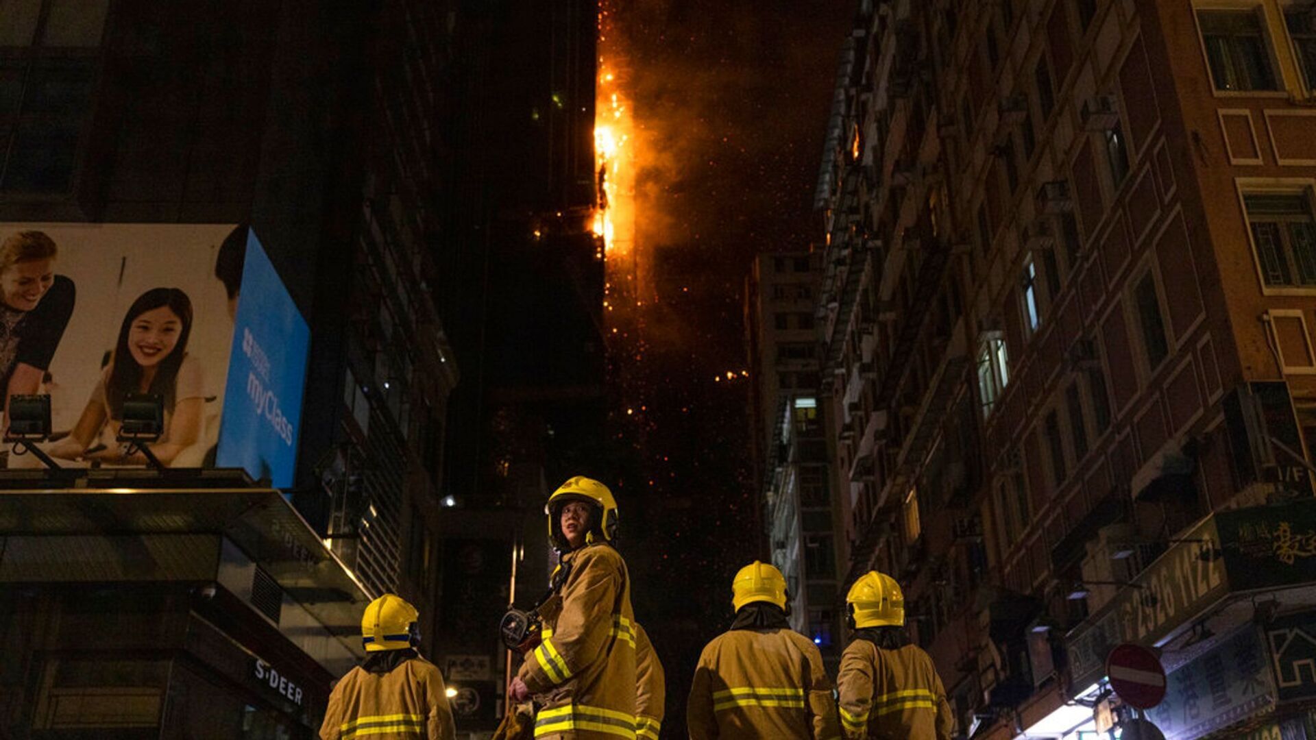 Гонконгские пожарные борются с высотным пожаром в популярном торговом районе