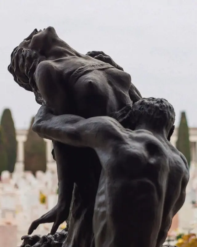 Скульптурная группа представляет молодую обнаженную женщину, которую страстно обнимает мужской мускулистый мужчина, так же обнаженную.