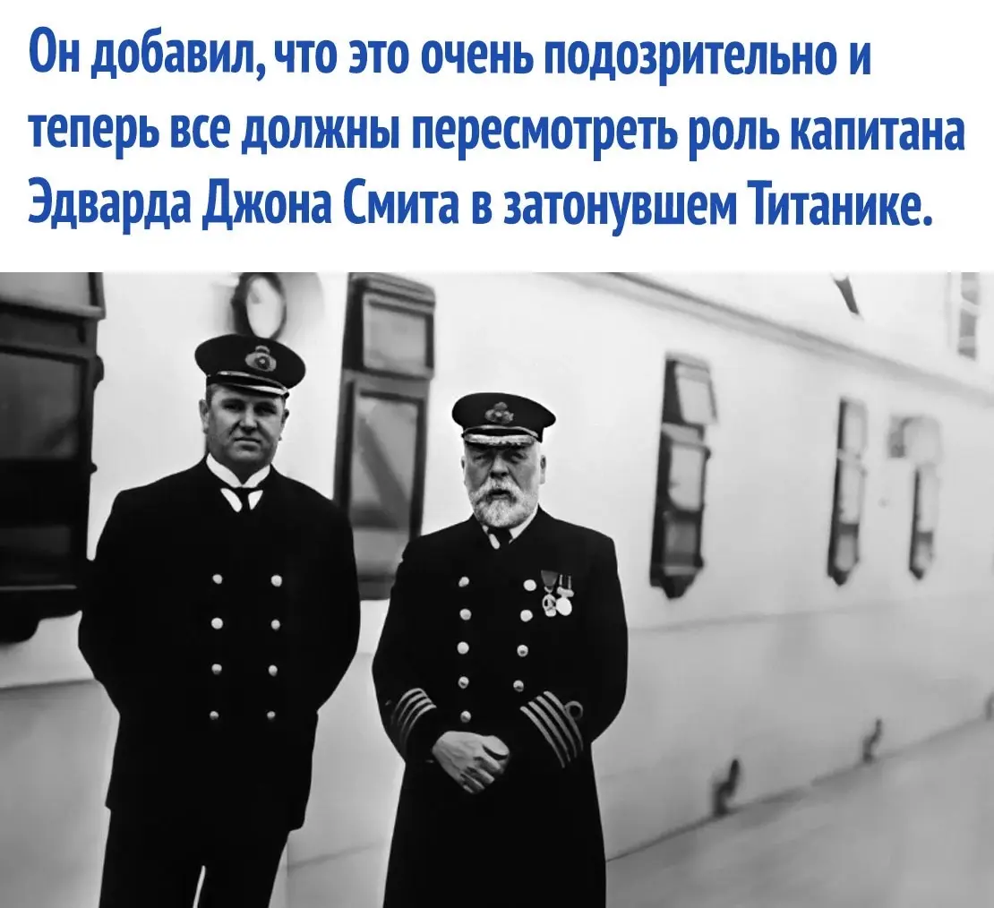 СМИ процитировали его слова: "Это изобретение позволяет нам по-новому взглянуть на то, что на самом деле произошло более ста лет назад". - На самом деле, это были россияне!Я могу предположить для себя, что в этом случае.Это весьма подозрительно. Нам нужно еще раз взглянуть на роль капитана Эдварда Джона Смита в гибели "Титаника".