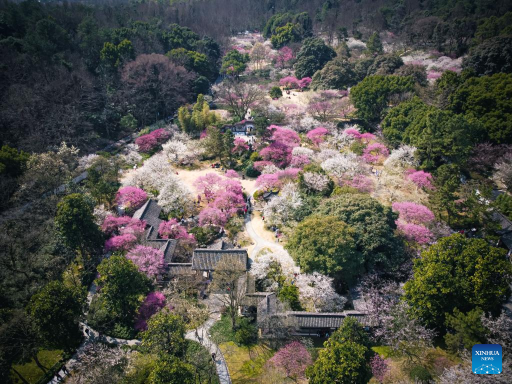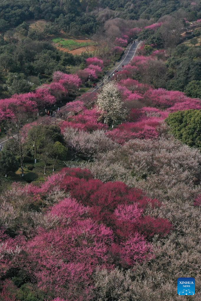 На этом аэрофотоснимке, сделанном 28 февраля 2023 года, видны цветущие сливы в ботаническом саду Ханчжоу в Ханчжоу, провинция Чжэцзян на востоке Китая. (Синьхуа/Цзян Хань)