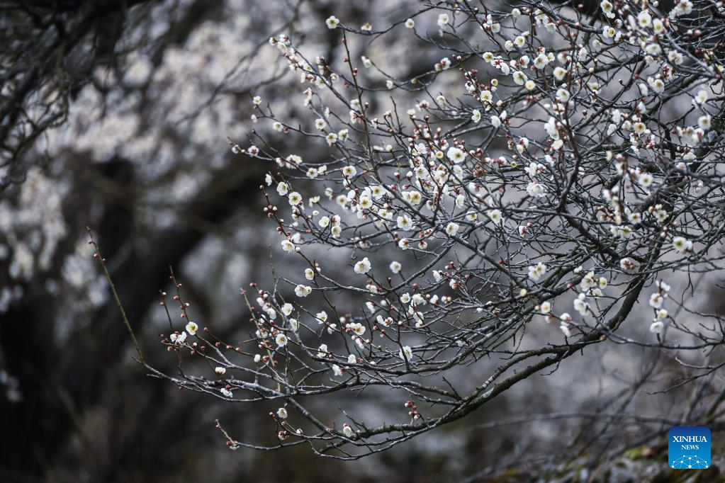 На этом снимке, сделанном 28 февраля 2023 года, видны цветущие сливы в деревне Цяньюань города Цзяньдэ, провинция Чжэцзян, Восточный Китай. (Синьхуа/Сюй Юй)