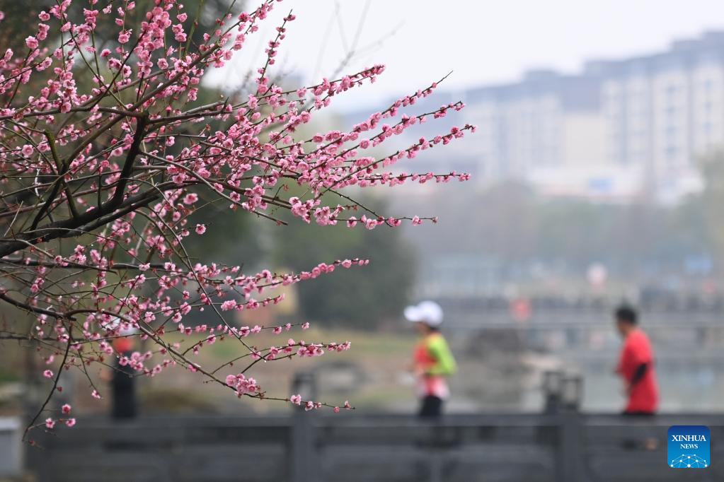 Бегуны пробегают мимо цветущих слив в парке Жэньху в районе Фэнхуа города Нинбо, провинция Чжэцзян, 1 марта 2023 г. (Синьхуа/Хуан Цзунчжи)