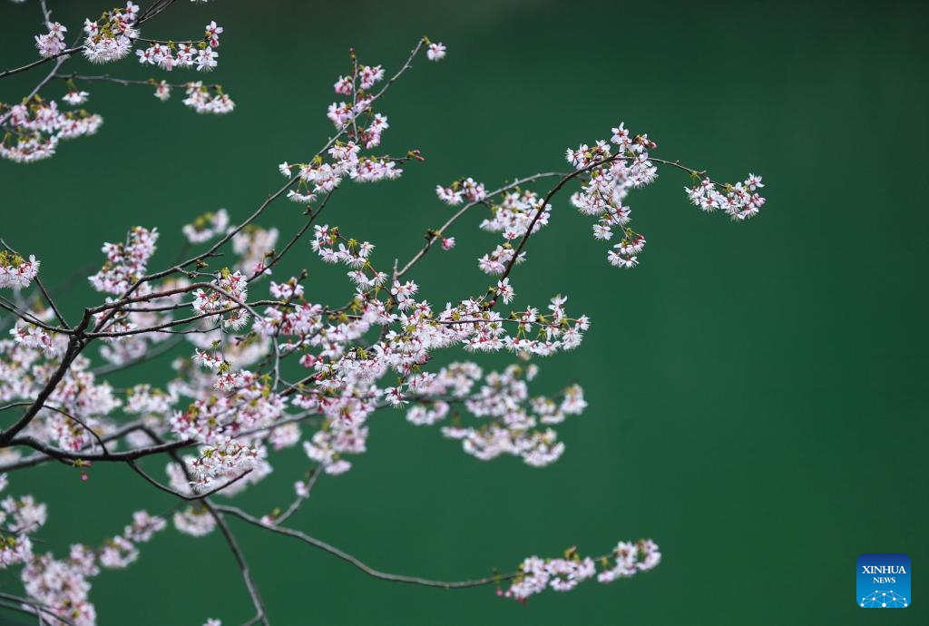На этом снимке, сделанном 1 марта 2023 года, изображены цветущие сакуры в деревне Датанг города Цзяньдэ, провинция Чжэцзян на востоке Китая. (Синьхуа/Сюй Юй)