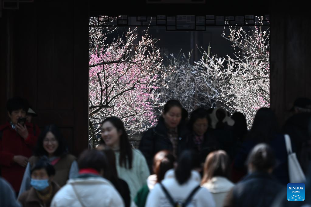 Туристы наслаждаются цветением сливы на лодках в Национальном парке водно-болотных угодий Сиси в Ханчжоу, провинция Чжэцзян, 18 февраля 2023 г. (Синьхуа/Вэн Синьян)