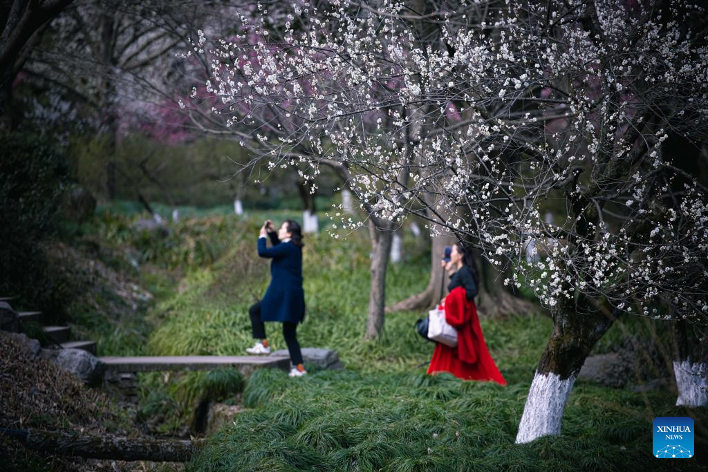 Посетители фотографируются в Ботаническом саду Ханчжоу в Ханчжоу, провинция Чжэцзян, Восточный Китай, 28 февраля 2023 г. (Синьхуа/Цзян Хань)