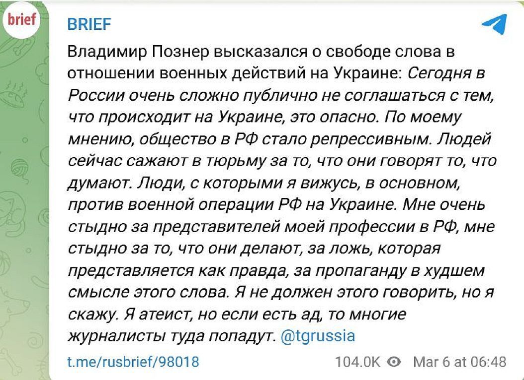 Кошмар. Перечисленные вами "несущие чушь" - политически образованные люди, объясняют нам что такое СВО и что такое США,ЕС и их отношение к России. Без их "чуши" будем сидеть без информации и знать не будем что, где , когда происходит. И между прочим они, патриоты России, подвергают себя большой опасности, не дай Бог, теракт. А Познер давно выбрал себе по духу страну проживания и удивительно, что так долго ему на российском телевидении позволяли заниматься словоблудием в ущерб России.