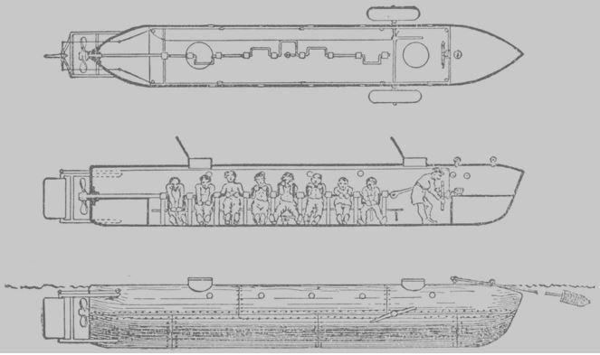 Построенный в 1863 году инженером Горацием Лоусоном Хэнли для Южного флота во время Гражданской войны в США, 12-метровый "Ханли" управлялся экипажем из восьми человек, которые работали в ужасной тесноте из-за высоты подводной лодки всего 1,3 метра. Экипаж состоял из семи членов, которые вращали коленчатый вал для приведения в действие гребного винта, и одного члена, который управлял кораблем. Подводная лодка имела люки для экипажа в передней и задней частях корпуса, и для быстрого всплытия экипаж мог отсоединить балластный киль изнутри.