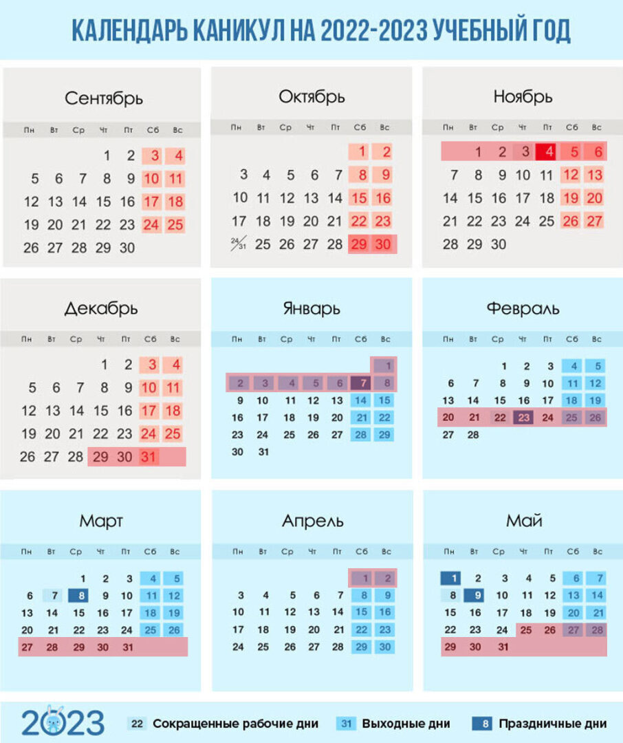Хотя школы и вправе сами устанавливать график школьных каникул, однако большинство из них придерживаются рекомендаций Минпросвещения. Вероятнее всего, что ваша школа тоже установит школьные каникулы в эти дни*:...