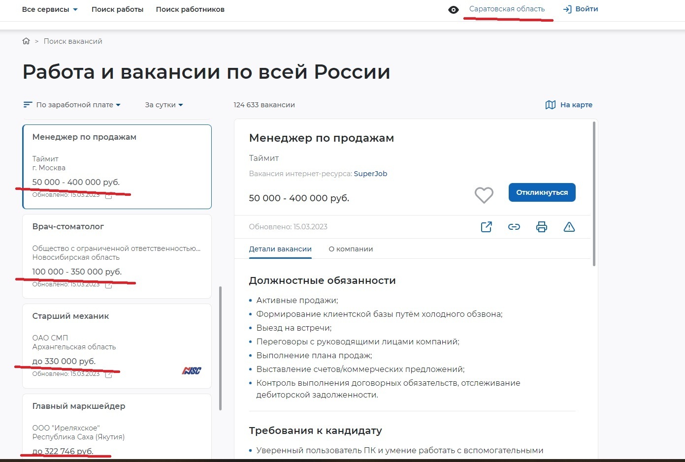 Ну вот зашел я на официальный сайт ЦЗН - работа в России. выбираю вакансии Саратовской области и вижу зарплаты по 300 тысяч. К чему эти сказки про отсутствие работы? Может у вас квалификация отсутствует, так это другой разговор.
