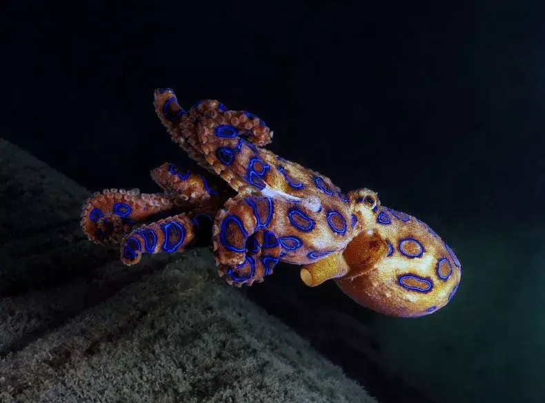Осьминоги с синими кольцами - одни из самых ядовитых существ в мире, и их яда достаточно, чтобы убить 26 взрослых людей в течение нескольких минут. Их яд, содержащий тетродотоксин, вырабатывается симбиотическими бактериями в слюнных железах осьминога и, как говорят, более чем на 1200 более токсичен, чем цианид.