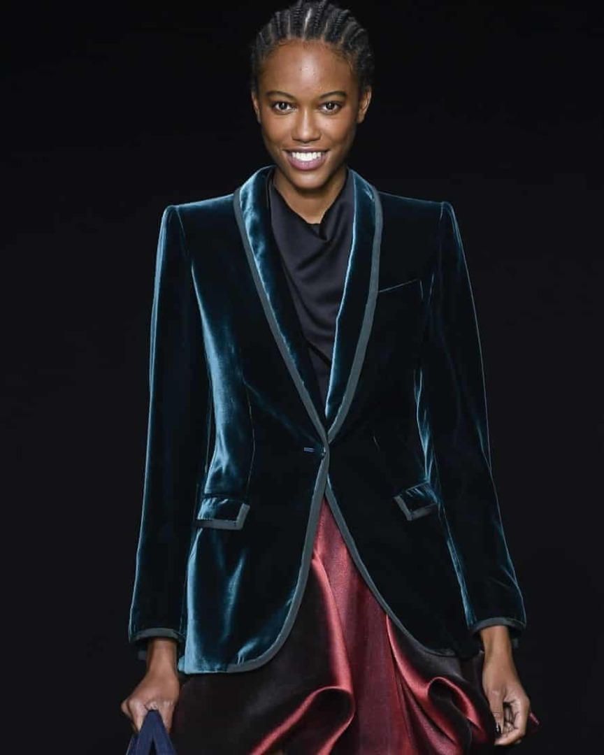 Ещё одна улыбающаяся модель на показе Emporio Armani в Милане в феврале 2023 года.