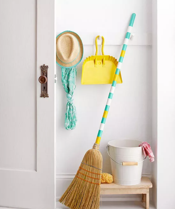 Украсьте свою уборку ярким полосатым веником. Оберните полоски малярного скотча шириной 1½ дюйма вокруг деревянной ручки, приклеивая каждую полоску к следующей по всей длине ручки. Удалите нужные полосы ленты; нанесите краску первого цвета на открытые участки. После высыхания накройте окрашенные участки новыми полосами ленты и снимите полосы для второго цвета. Продолжайте процесс, пока вся ручка не будет окрашена. Для полного комплекта подметания нанесите аэрозольную краску и на соответствующий совок.