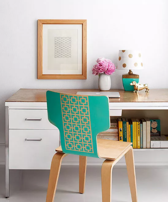 Украсьте обычную спинку стула рисунком, нанеся на нее трафарет. Чтобы зафиксировать трафарет на месте, нанесите на заднюю часть пластикового трафарета аэрозольный клей, затем прижмите трафарет к спинке стула. Закрепите ленту по краю спинки стула, а сиденье, ножки и боковины стула защитите пластиком. Нанесите аэрозольную краску на отверстия трафарета и по краям трафарета. Нанесите два слоя, давая краске высохнуть после каждого слоя. Снимите трафарет и вытрите все остатки, оставшиеся на стуле. В завершение нанесите пару слоев прозрачного глянцевого лака.