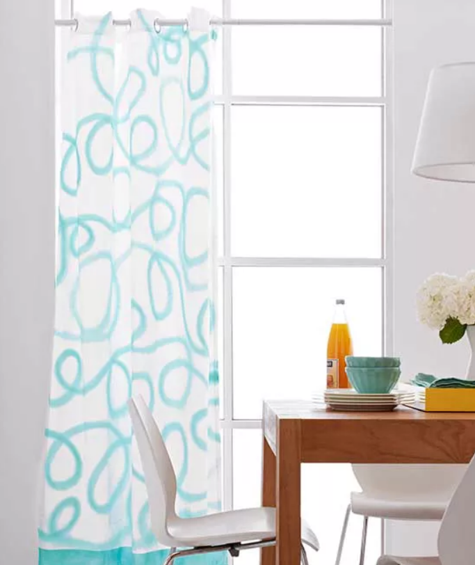Петельки в стиле фристайл выглядят эффектно, если нанести их спреем на купленную белую занавеску. Начиная со свежеотжатой шторы, приклейте ленту по нижнему подолу и повесьте штору вертикально с защитным куском пластика за ней (высокий открытый забор отлично подходит для поддержания шторы). Убедитесь, что все висит ровно. Используя аэрозольную краску, рекомендованную для ткани (например, Krylon ColorMaster Enamel), держите баллончик вертикально, чтобы равномерно распылить краску на границу под лентой. Снимите ленту, затем распылите краску по контурам ткани. Если идея распылять петли в произвольном порядке вас нервирует, нарисуйте узор с помощью водо- или воздухорастворимого фломастера, а затем распылите краску.