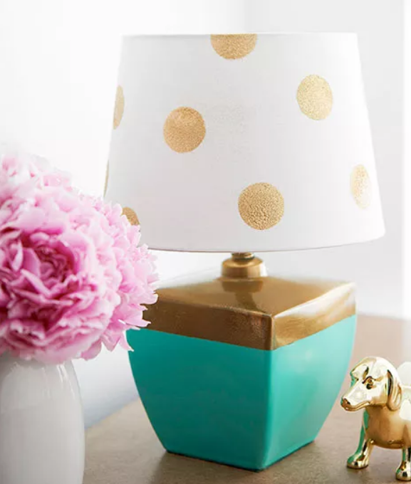 Украсьте унылую лампу металлическими акцентами. Обмотайте малярным скотчем шнур и верхнюю часть основания лампы, затем нанесите универсальную грунтовку и краску под скотч (мы использовали краску цвета аква). Когда краска высохнет, нанесите на нее прозрачный герметик, дайте высохнуть и снимите ленту. Отклейте ленту с окрашенной части и покройте верхнюю часть золотой металлической краской. Для абажура вырежьте круги из кардстока, чтобы сделать трафарет. Прижмите трафарет к абажуру, посыпьте золотым глиттером и дайте высохнуть. Нанесите прозрачный герметик, чтобы предотвратить отслаивание.