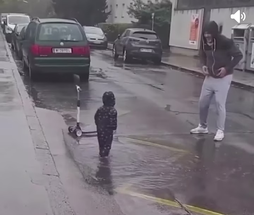 В этом ролике три счастливых ребенка веселятся в луже после сильного дождя.