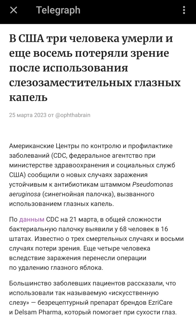 Мы уже освещали эту проблему. Но продолжаются сообщения о смертях после использования глазных капель, заражённых, по словам Центра по контролю и профилактике заболеваний США, «редким штаммом бактерии с широкой лекарственной устойчивостью P. aeruginosa».